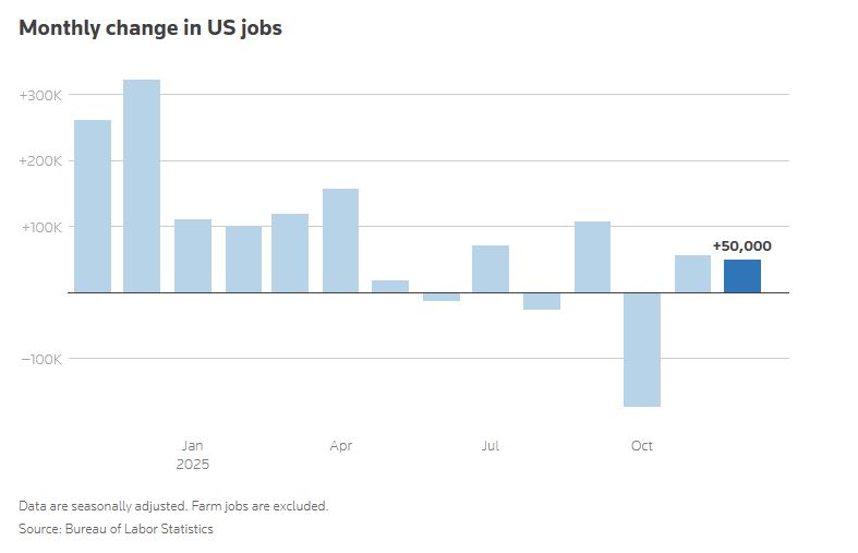 கடந்த மாதத்தில், விவசாயத் துறையைத் தவிர்ந்த புதிய வேலைவாய்ப்புகள் ஐம்பதாயிரம் மட்டுமே உருவானதாக தொழிலாளர் புள்ளிவிவரத் துறை தெரிவித்துள்ளது. நவம்பர் மாத வேலைவாய்ப்பு எண்ணிக்கையும் முன்பு அறிவித்த அளவிலிருந்து குறைக்கப்பட்டுள்ளது. நிறுவனங்கள் புதிய பணியாளர்களை நியமிப்பதில் எச்சரிக்கையாக நடந்து கொள்வதே இந்த மந்த நிலைக்கு காரணமாகக் கருதப்படுகிறது.